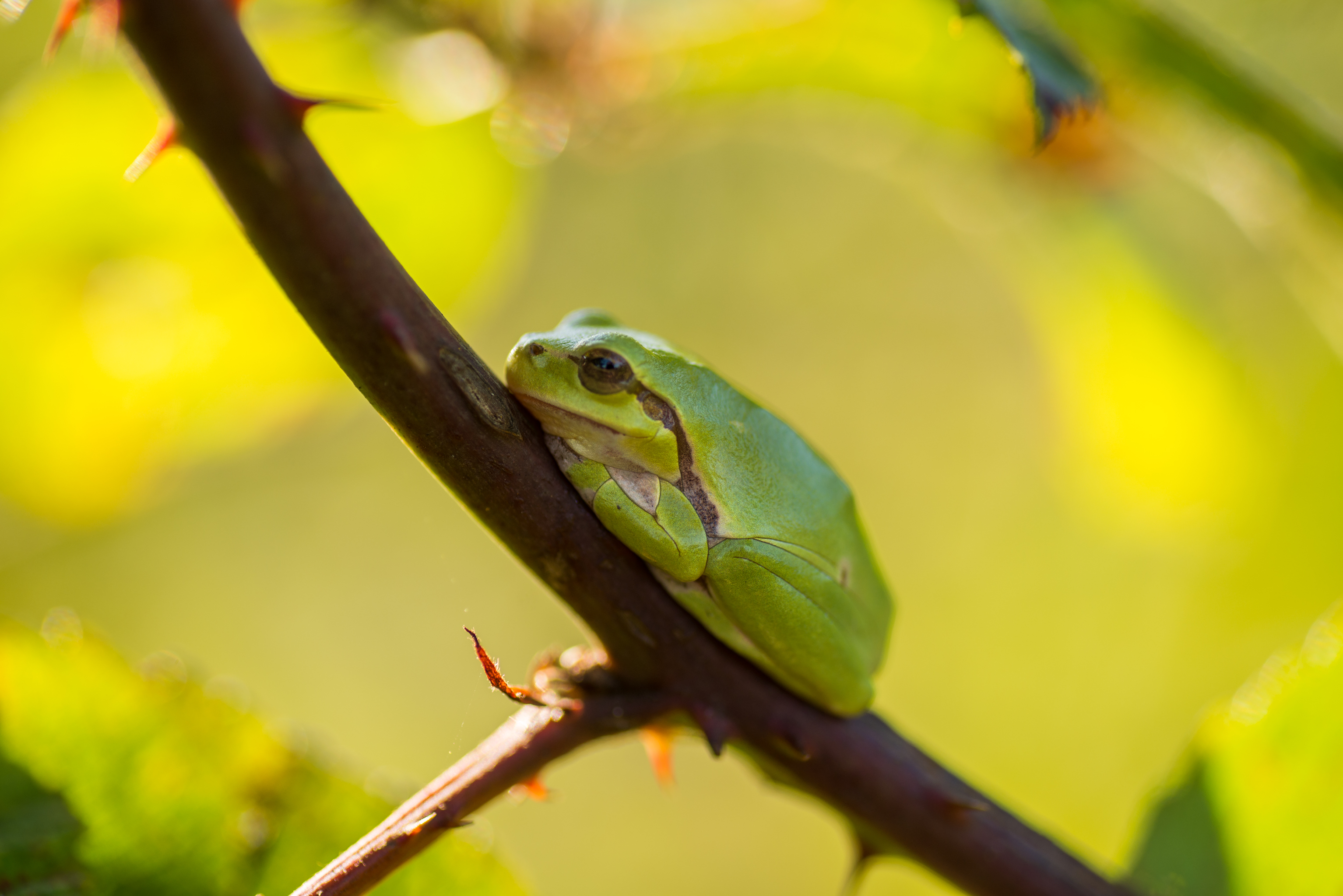 Nu ik ze eindelijk gevonden had spendeerde ik 2 opeenvolgende namiddagen bij de vindplaats van de boomkikkers en kon ik hun gedrag ook observeren. Bij zonnig weer liggen ze bijna de hele dag te zonnen tussen de doorns van de braamstruiken en er is maar weinig wat ze kan storen. Je ziet ze dan ook heel ontspannen erbij liggen met ingetrokken pootjes. Het felle zonlicht maakt het niet altijd even makkelijk om ze te fotograferen.